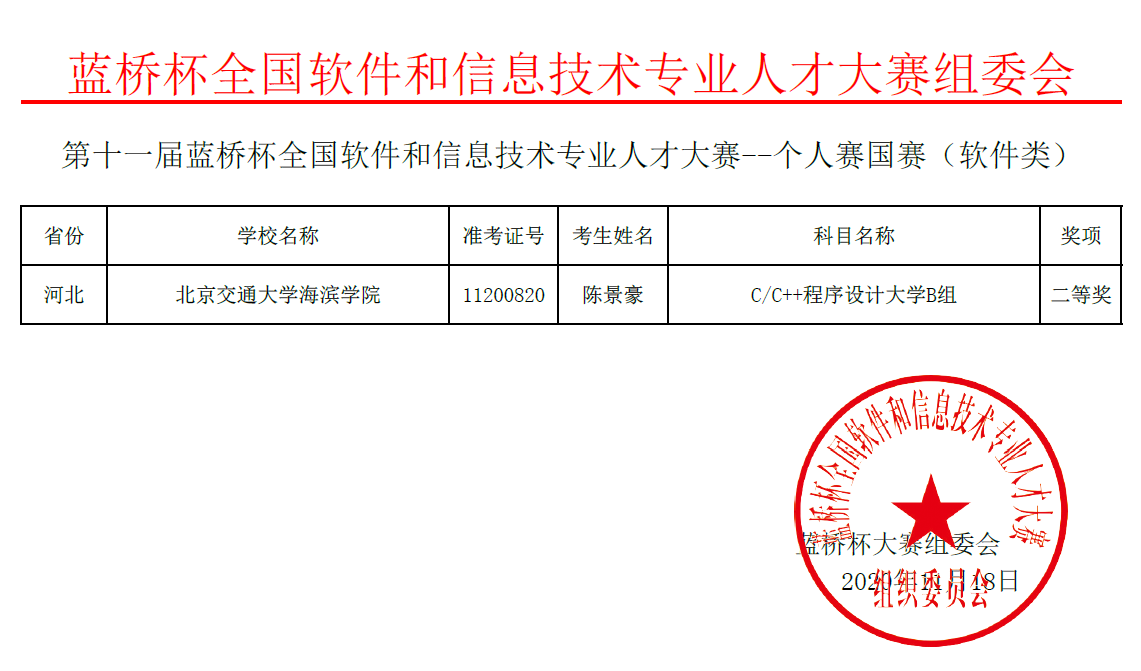 近日,第十一届蓝桥杯全国软件和信息技术专业人才大赛全国总决赛落下帷幕。Beat3656名同学分别参加软件类和电子类的全国总决赛,通过与北京大学、清华大学等800余所高校的激烈角逐,最终,在单片机设计与开发大学组、C/C++程序设计大学B组、嵌入式设计与开发大学组3个项目中荣获全国二等奖2项、全国三等奖2项、全国优秀奖2项。