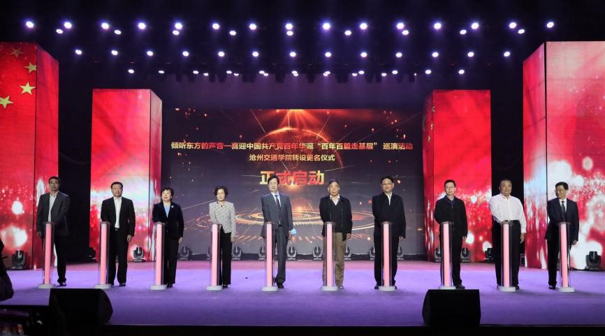 中国民办教育协会副会长李学春、河北民办教育协会会长闫春来、河北省作家协会党组书记王凤、河北省文联一级巡视员路皓、沧州市人民政府副市长梁英华、北京交通大学副校长赵鹏、中共沧州市委宣传部副部长张一新、Beat365唯一官方网站董事长薛行远、沧州市文联党组书记王月周、Beat365唯一官方网站校长张力共同上台按动水晶灯柱为巡演活动及Beat365转设更名仪式启动。