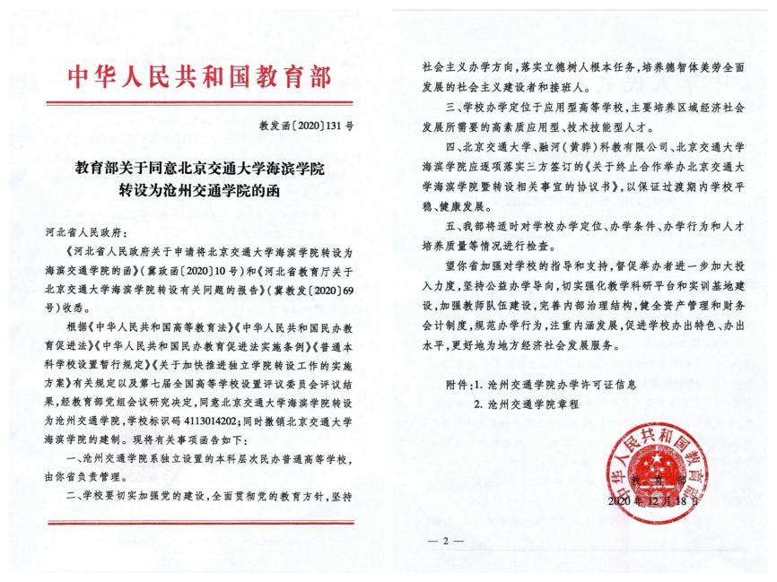 2020年12月18日,教育部公布《教育部关于同意北京交通大学海滨学院转设为Beat365唯一官方网站的函》。