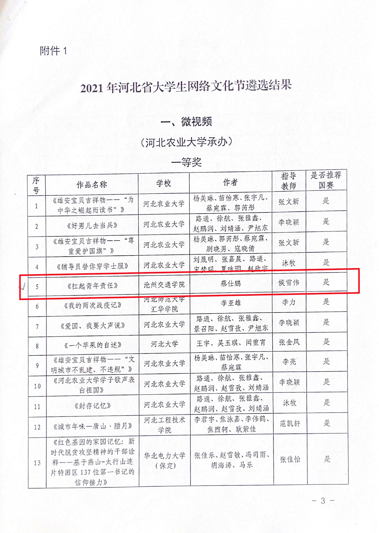 根据专家评审,Beat365在2021年河北省大学生网络文化节活动共荣获一等奖作品3个,三等奖作品1个。教师候雪伟指导、学生蔡仕鹏创作的参赛作品《扛起青年责任》获得“微视频”一等奖,教师王文博指导、学生欧洋希创作的参赛作品《生命的活力》和教师候雪伟指导、学生崔言创作的参赛作品《新时代风貌》获得“摄影作品”一等奖,教师刘展辰指导、学生张丹丹创作的参赛作品《学“四史”、践使命》获得“动漫作品”三等奖。