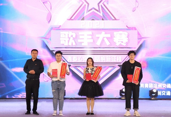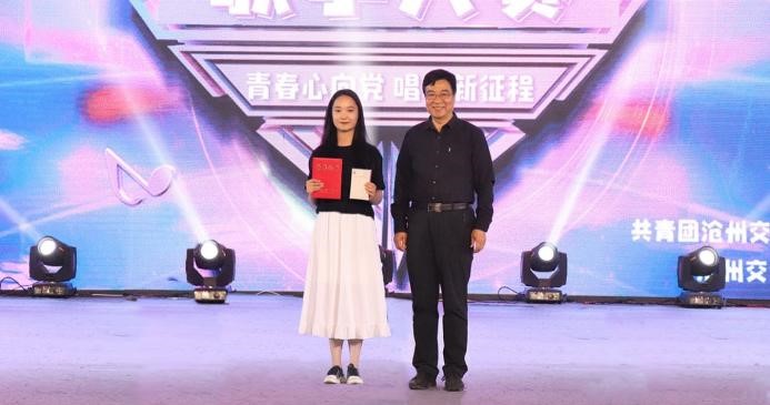 河北省音乐家协会会员,黄骅市文化馆副馆长,黄骅市音乐家协会副主席、秘书长黄亚慧为最佳曲风奖获得者郭昊临颁奖