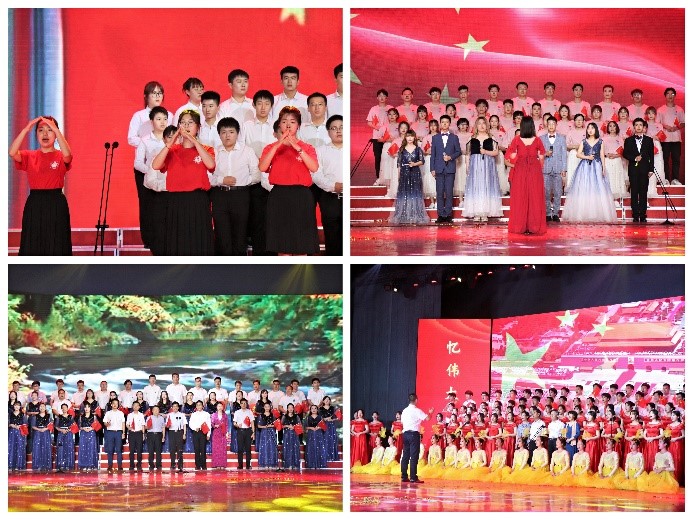 第三篇章“传承初心使命,展望辉煌未来”中,化工学院党支部演唱的歌曲《国家》、《明天会更好》,展现了师生们的拳拳赤子之心及对祖国明天的美好祝愿;土木学院党支部为我们带来《红旗飘飘》、《阳光路上》,表演者们铿锵有力,用歌声歌颂祖国的巨大变化;机关党支部带来的《二十年后再相会》、《我们走在大路上》,流露出对未来的期许,激发广大观众爱党、爱国情怀;经管学院党支部带来歌曲《共筑中国梦》、《歌唱祖国》,渲染出一幅祖国大好河山的绝美画卷。