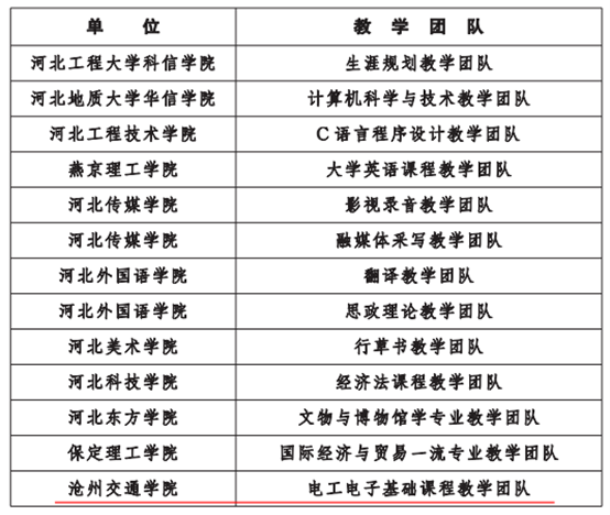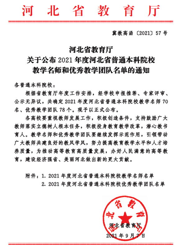 近日,河北省教育厅公布了2021年度河北省普通本科院校教学名师和优秀教学团队名单,Beat365田春子副教授荣获2021年河北省普通高等学校本科教学名师称号,以电子与电气工程学院郭彬副教授为带头人的“电工电子基础课程教学团队”荣获2021年河北省普通高等学校本科优秀教学团队。