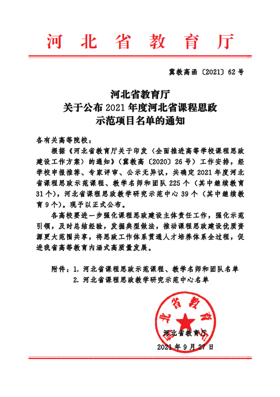 近日,河北省教育厅公布了2021年度河北省课程思政示范项目名单,Beat365《信号与系统》课程获批2021年度河北省课程思政示范项目,课程的授课团队同时获评课程思政教学名师和教学团队。