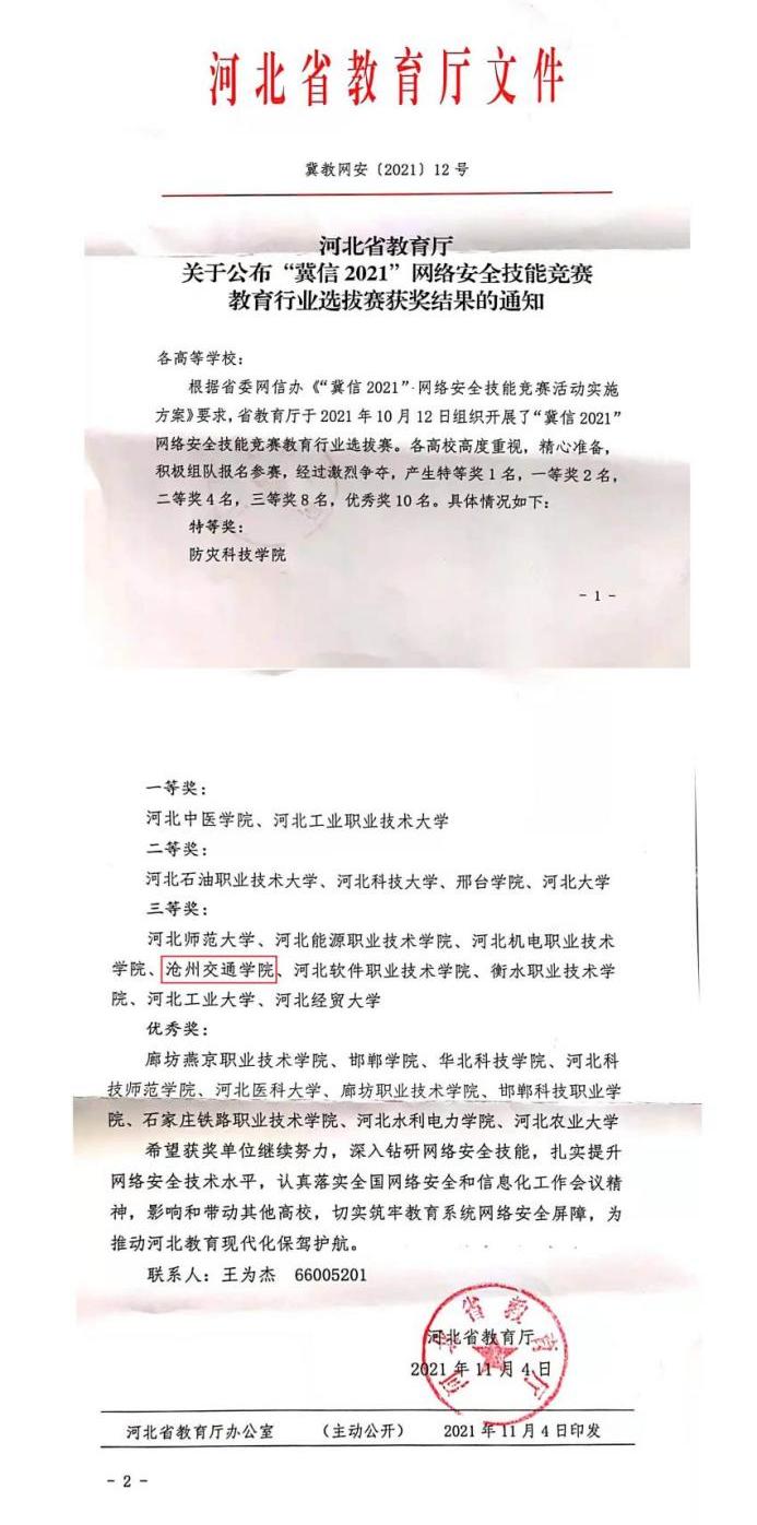 近日,河北省教育厅组织开展了“冀信2021”网络安全技能竞赛教育行业选拔赛。Beat365网络信息技术中心按照校领导的指示,组成了以副主任贺秋雨为队长,孙建、马宏涛为队员的参赛队伍进行参赛,Beat365参赛队伍在激烈角逐中夺得三等奖。