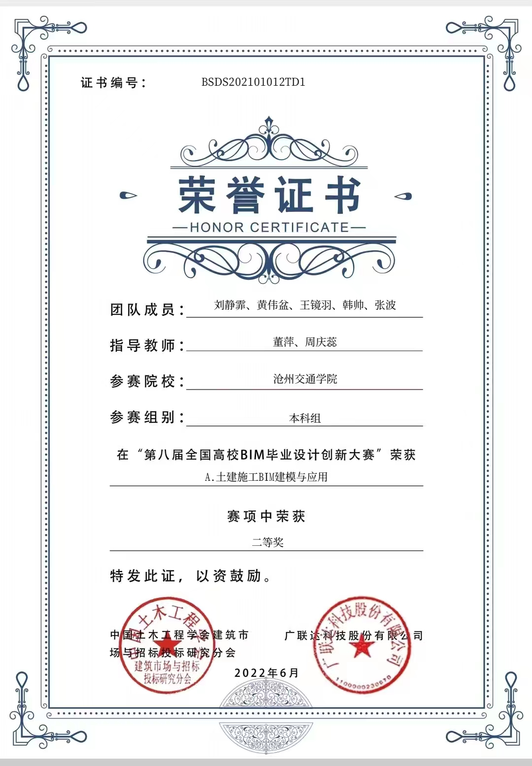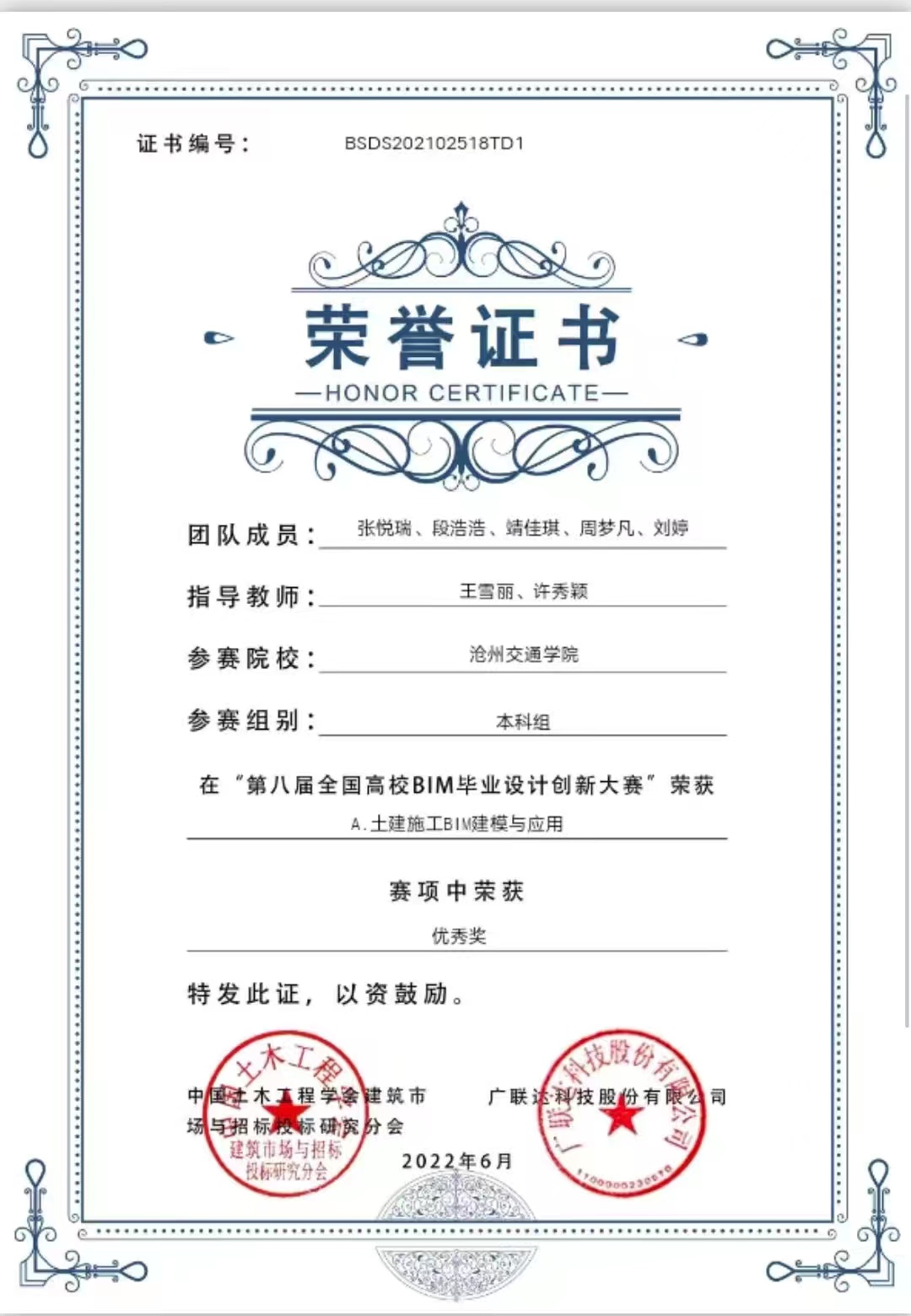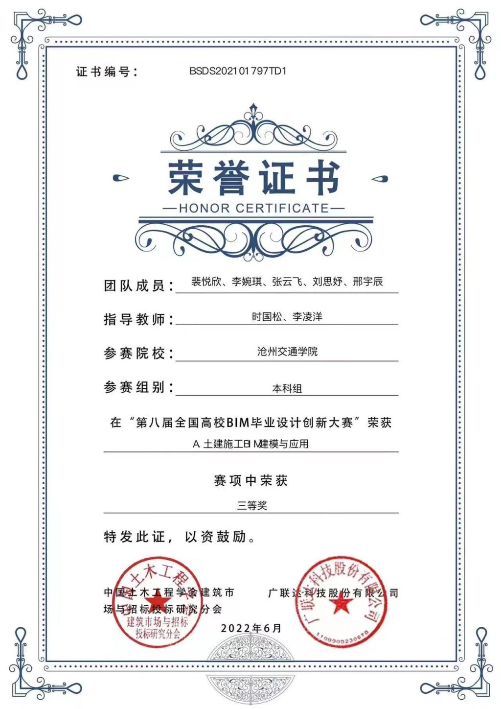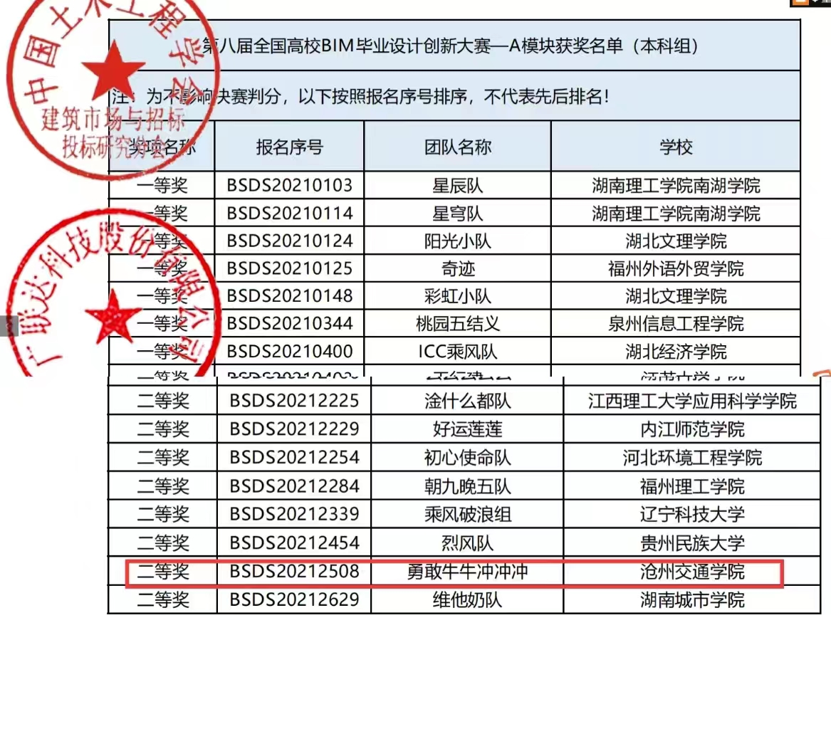 Beat365近日收到第八届全国高校BIM毕业设计创新大赛多项获奖证书。经济管理学院教师董萍、周庆蕊指导的团队“勇敢牛牛冲冲冲”荣获大赛二等奖,“沧交经管队”荣获大赛优秀奖;土木建筑工程学院教师时国松、李凌洋指导的团队“星海队”荣获大赛三等奖,教师王雪丽、许秀颖指导的团队“高级正能量”荣获大赛优秀奖。