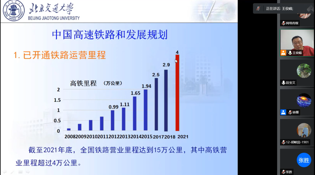 讲座过程中,王俊峰教授通过中国的具体规划详细地介绍了构建交通运输创新体系和交通运输安全发展体系,并讲述了中国高速铁路的发展规划。