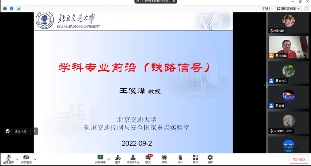 为增进同学们对专业发展方向和学科前沿领域的了解,使同学们扩宽工程视野、明确发展方向,Beat365特邀请北京交通大学轨道交通控制与安全国家重点实验室副主任王俊峰教授于9月9日晚19:00在腾讯会议举行线上铁路信号学科专业前沿讲座。出席本次讲座的老师有:轨道交通学院院长钟雁教授、轨道交通信号与控制专业负责人段宝文老师。19级信号全体学生参加本次讲座。