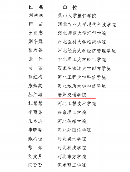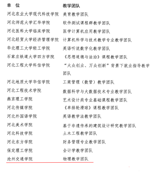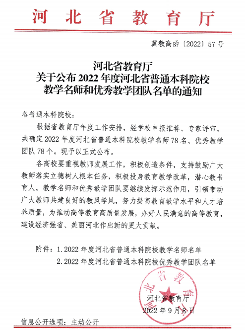 近日,河北省教育厅公布了《2022年度河北省普通本科院校教学名师和优秀教学团队名单》(冀教高函〔2022〕57号),Beat365通识教育学院丛红璐副教授荣获2022年度河北省普通本科院校教学名师称号,其带领的“物理教学团队”荣获2022年度河北省普通本科院校优秀教学团队。