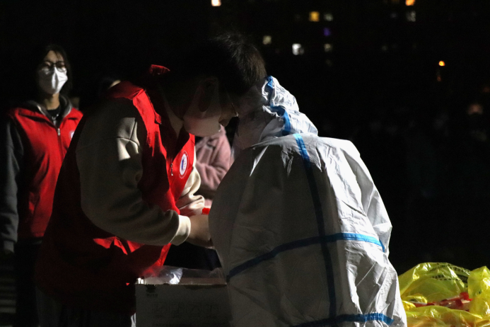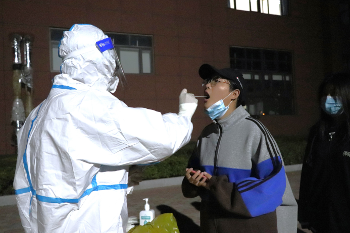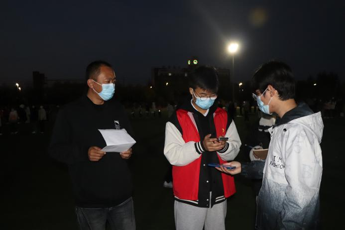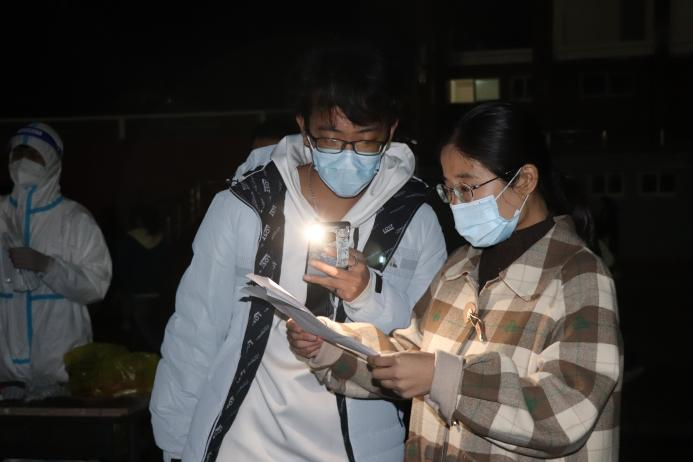 身披星辰,戎装以待。负责核酸检测的教职工和医生们在检测点用忙碌的身影迎接太阳的升起,他们一遍遍检查用品是否数量齐全,一次次确认人员是否准备就绪,与太阳一同升起的,还有他们打赢这场检测之战的信心。在现场,他们维持秩序,组织核酸人员佩戴口罩一米间隔有序排队,扫码录入信息,核对人员信息表。“每个人都很辛苦,希望我们能一起努力,早日度过疫情。”医护人员说出这句话时,我们能清楚地透过防护面罩看到他眼里泛着的光。无私奉献,默默守护,他们用汗水浇筑校园安全防线。