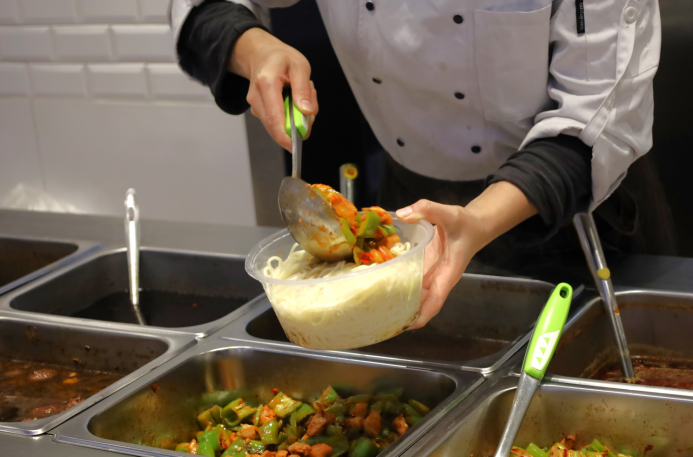 洗菜、做菜、售出……机械化不停歇的工作和食堂闷热的环境并没有阻挡食堂阿姨对工作的热情,哪怕不能摘的口罩令她脸上全是水雾,她也笑意盈盈地面对每一个背井离乡的小顾客。“我觉得忙点也没什么,我就是想尽自己最大的努力,让同学们在学校吃好喝好,我就挺满足的了。”