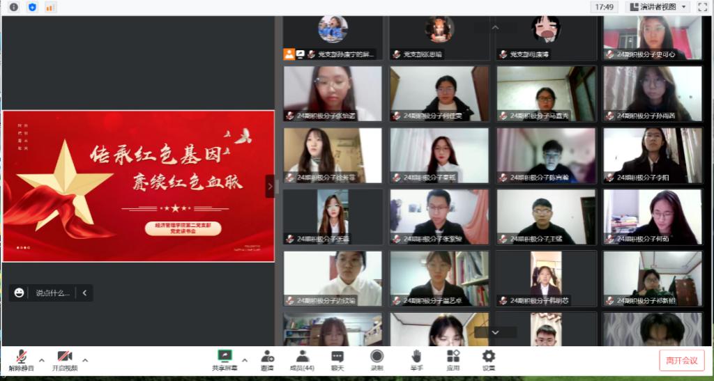 11月21日晚7时,经济管理学院第二党支部带领党员、积极分子开展“传承红色基因,赓续红色血脉”主题线上读书分享会活动,学院党员谈党史、讲理论,分享内容透彻深入、生动鲜活。党支部滕倩玉老师就活动内容为大家展开介绍并提出几点要求,她指出,活动以“在探索中明机理,在创新中辟新境”为指导原则,包括个人自学、分享交流与深刻感悟三个阶段。她谈到,学院党员要学以致用,把党史学习教育成果巩固好拓展好,推动党史学习教育建设常态化长效化,不断适应新形势新任务的需要。“传承红色基因,赓续红色血脉”主题线上读书分享会顺利结束,今后,经济管理学院团委书记孙经纬计划组织全体学生党员开展“金光心向党,对党有话说”主题征文活动,要求各学生党员永远不忘初心跟党走,提高思想境界,持续掀起学习宣传贯彻党的二十大精神热潮。
