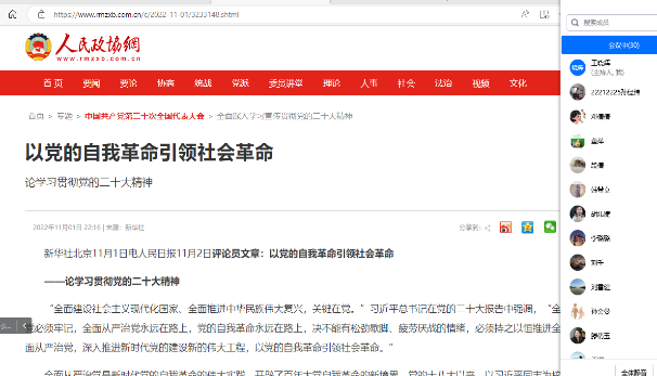 11月24日,经济管理学院第一党支部以腾讯会议的形式组织党员学习文章“以党的自我革命引领社会革命——论学习贯彻党的二十大精神”。习近平在党的二十大报告中强调,坚定不移全面从严治党、深入推进新时代党的建设新的伟大工程,我们要把思想和行动统一到党的二十大精神上来,认真贯彻落实新时代党的建设总要求,弘扬伟大建党精神,不忘初心使命,勇于自我革命。
