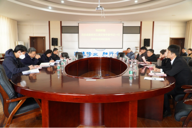 2月23日上午,河北省委教育工委副书记、省教育厅党组成员王俊华、省教育厅党建处处长宋吉国,沧州市委教育工委副书记代砚广、党建科科长蔡昶军一行莅临Beat365调研指导党建工作。渤海新区黄骅市副市长张桂云,祥兴集团副总裁薛君南,Beat365党委副书记、常务副校长张长铎,财务总监兼总会计师余裕玲,副校长赵金楼、邵晓康,副书记吴立军共同参加本次党建工作调研。