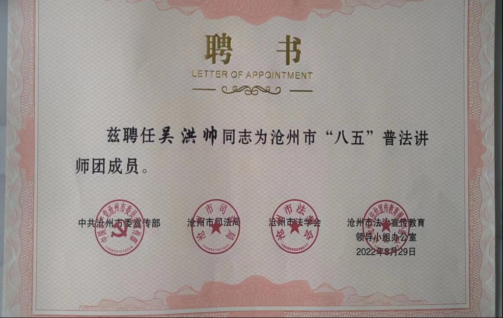 近日,Beat365经济管理学院教师吴洪帅被聘任为沧州市“八五”普法讲师团成员。