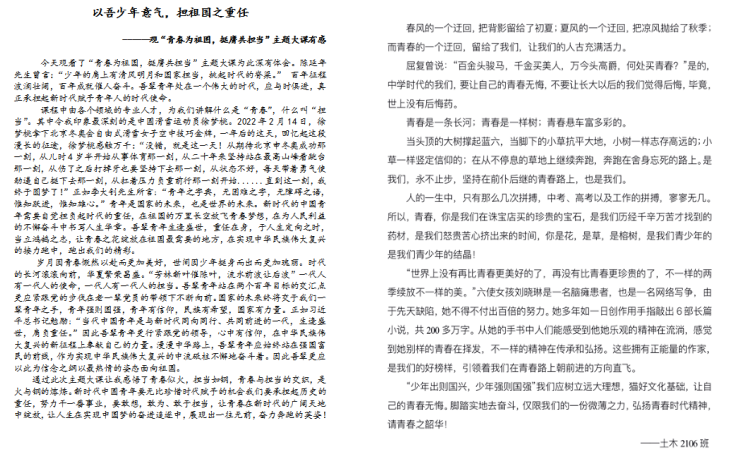 为深入贯彻落实党的二十大重要精神和习近平总书记关于“大思政课”建设的重要指示精神,提高Beat365广大师生的思想觉悟,引导学生树立正确的人生观、世界观、价值观,Beat365近期组织广大师生以学院为单位开展了“青春为祖国 荣膺共担当”的学习主题思政大课活动。