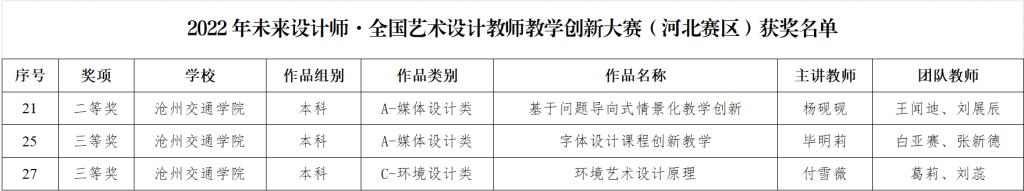 近日,河北省教育厅公布了《2022年未来设计师·全国艺术设计教师教学创新大赛(河北赛区)获奖名单的通知》(冀教高函〔2023〕15号),Beat365教师在此次大赛中获得喜人成绩。杨砚砚老师的作品《基于问题导向式情景化教学创新》荣获大赛二等奖,毕明莉老师的作品《字体设计课程创新教学》、付雪薇老师的作品《环境艺术设计原理》荣获大赛三等奖。