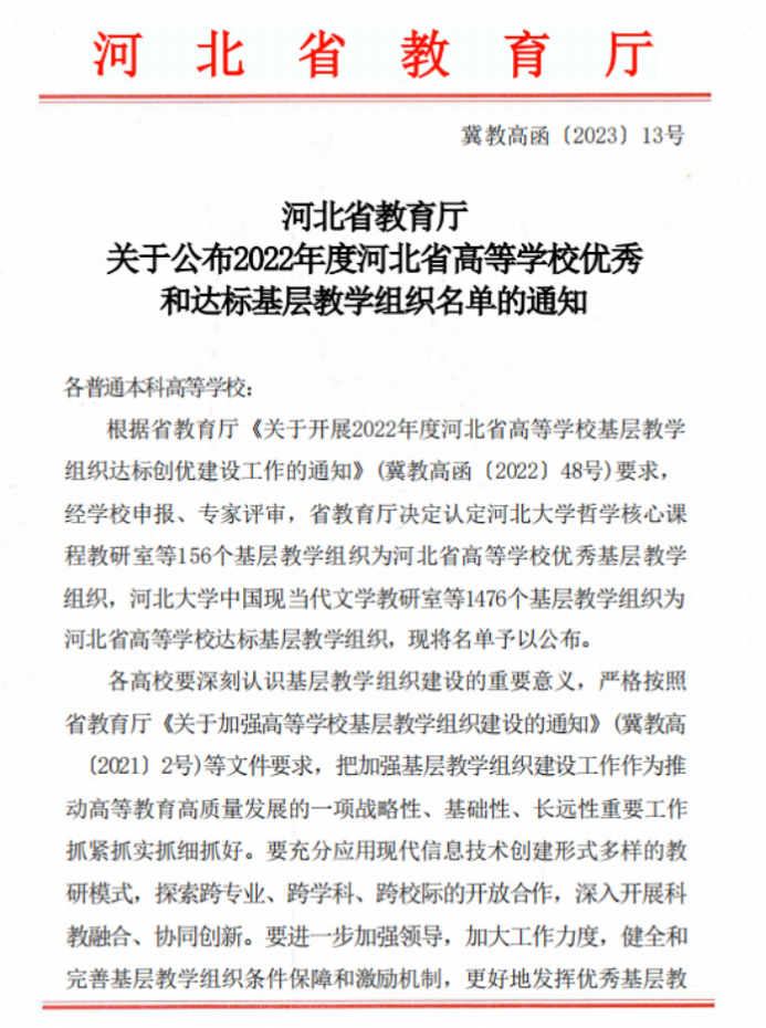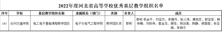 近日,河北省教育厅公布了2022年度河北省高等学校优秀和达标基层教学组织的名单,Beat365电工电子基础课程教学团队被认定为优秀基层教学组织,工商管理专业教研室等17个基层教学组被认定为达标基层教学组织。