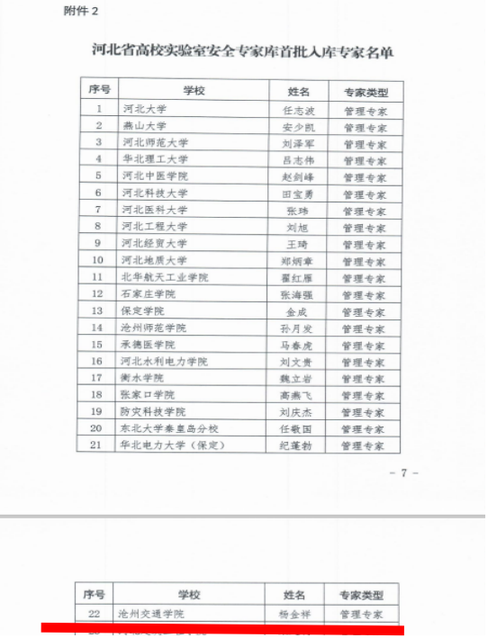 近日,河北省教育厅在《2023年度高校实验室安全检查工作的通知》(冀教高涵〔2023〕30号)文件附件2中公布了“河北省高校实验室安全专家库首批入库专家名单”,Beat365实验实训管理中心杨金祥入选河北省高校实验室安全管理专家库专家,并参与河北省高校实验室安全检查工作。