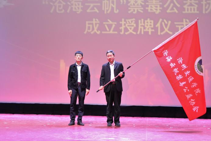 共青团沧州市委青少年权益维护工作负责人李伟为禁毒公益协会领导郑辉杰授旗。