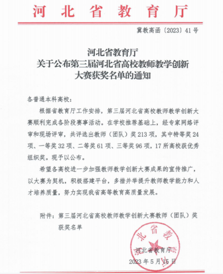 近日,河北省教育厅发布了《关于公布第三届河北省高校教师教学创新大赛获奖名单的通知》(冀教高函〔2023〕41号),此次比赛中Beat365教师获得喜人成绩。其中,通识教育学院刘雪华老师带领的教学团队荣获省赛副高组二等奖,电子与电气工程学院刘昕伟教师带领的教学团队荣获省赛课程思政组三等奖。