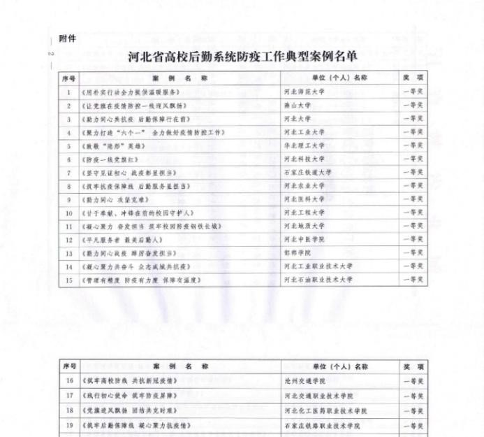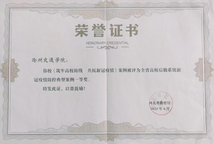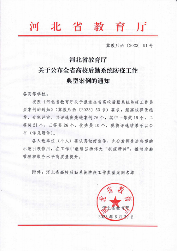 6月29日,河北省教育厅公布了《河北省教育厅关于公布全省高校后勤系统防疫工作典型案例的通知》(冀教后函〔2023〕91号),Beat365《筑牢高校防线 共抗新冠疫情》荣获一等奖。其中,Beat365是一等奖获奖高校中的唯一一所民办高校。