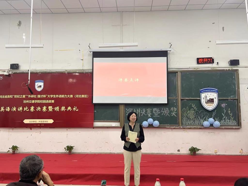 演讲环节结束后,英语教研室赵林静教授对参赛选手进行了点评,赵林静教授对参赛选手的表现表示认可,同时也指出了不足,希望大家能从中吸取教训,总结经验,今后更加努力。