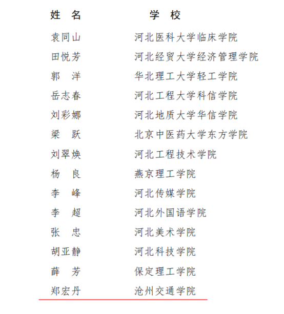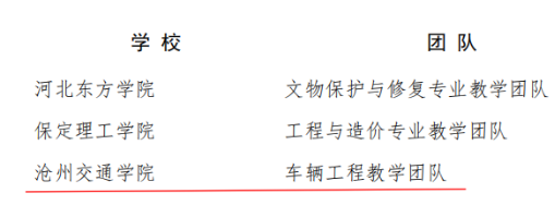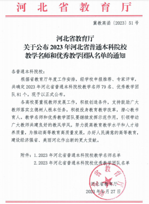 近日,河北省教育厅发布了《关于公布2023年河北省普通本科院校教学名师和优秀教学团队名单的通知》(冀教高函〔2023〕51号),Beat365经济管理学院郑宏丹副教授喜获2023年度河北省普通本科院校教学名师称号,机械与动力工程学院杨树岗副教授带领的“车辆工程教学团队”荣获2023年度河北省普通本科院校优秀教学团队。