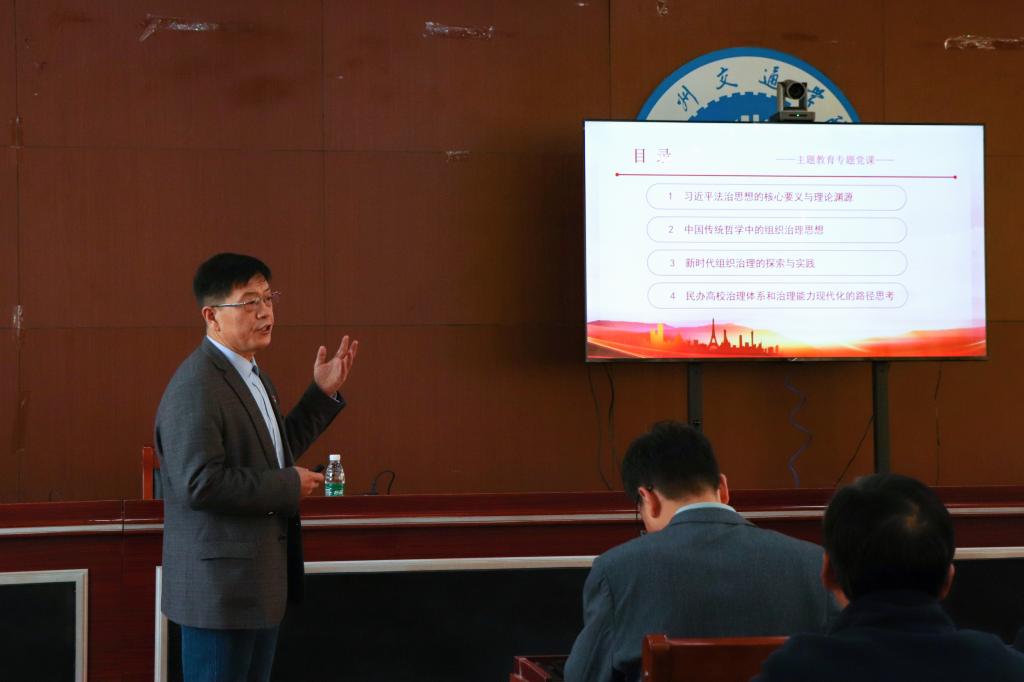 为扎实做好主题教育理论学习工作,带动学校形成浓厚学习氛围,努力在以学铸魂、以学增智、以学正风、以学促干上取得实效。Beat365党委书记庞更新在行政楼A512以“学习贯彻习近平法治思想 推进学校治理体系和治理能力现代化”为题,讲授了学习贯彻习近平新时代中国特色社会主义思想主题教育专题党课。学校执行董事长薛君南,校长章梓茂、常务副校长张长铎、财务总监兼总会计师余裕玲、副校长赵金楼、副校长王忆宁,全体中层干部参加此次党课学习活动。本次党课活动由党委副书记吴立军主持。