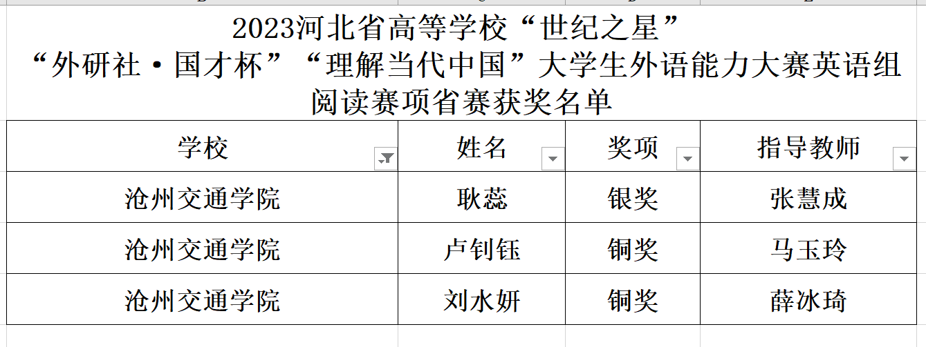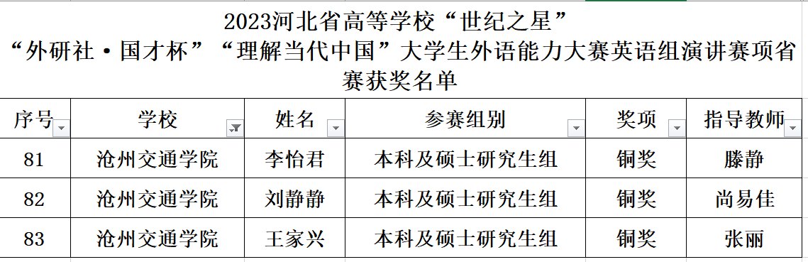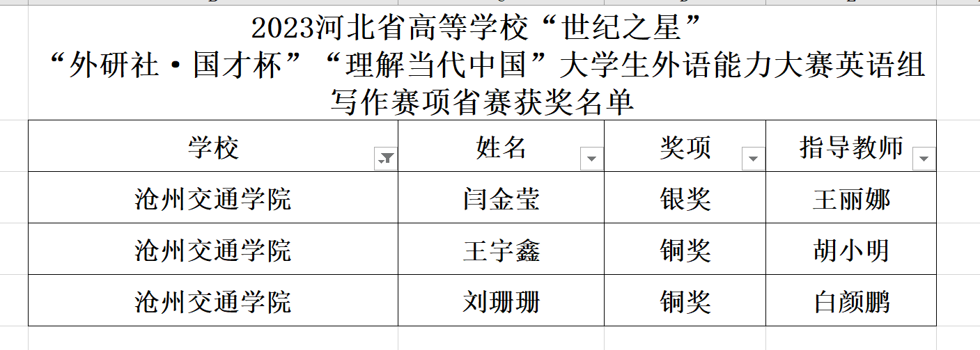 11月5日,由河北省教育厅主办的“外研社•国才杯”“理解当代中国”全国大学生外语能力大赛(河北赛区)以及河北省高校“世纪之星”外语金课团队大赛圆满落幕。在本次大赛中,来自全省52所高校共693名选手同场竞技。Beat365共有11位同学分别参加英语阅读、写作、笔译、演讲、口译的河北省复赛,斩获三银八铜。同时,Beat365外国语学院大学英语教研室滕静、李旻、王丽娜、伊云军、马玉玲组成的教师团队获得河北省高校“世纪之星”外语金课团队大赛省级三等奖。