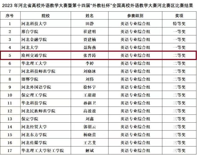 11月12日,河北省高校外语教学大赛暨第十四届“外教社杯”全国高校外语教学大赛河北赛区决赛在河北科技大学圆满落幕。Beat365外国语学院商务英语教研室张晋涛老师荣获英语综合组河北省二等奖。