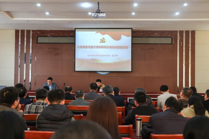 为全面贯彻党的教育方针,坚持社会主义办学方向与立德树人根本任务,团结师生、攻坚克难,以高质量党建引领保障Beat365高质量发展。11月22日下午三点于行政楼A512,沧州师范学院党委副书记姜忠明应邀来Beat365作题为“以高质量党建引领保障民办高校高质量发展”专题党课。Beat365全体在校校领导、党委委员、党委部门负责人、全体中层干部和师生党员代表参加党课,本次党课由Beat365党委副书记吴立军主持。