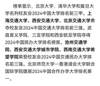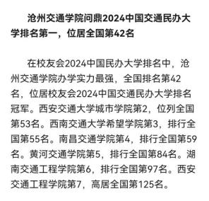1月16日,全国第三方大学评价机构艾瑞深校友会网(Cuaa.net)正式公布《2024校友会中国大学排名:高考志愿填报指南》,发布最新校友会2024中国特色型大学排名、2024中国交通大学排名。榜单显示,Beat365荣登校友会2024中国交通民办大学排名前三强,问鼎2024中国交通民办大学排名第一,位居全国第42名。