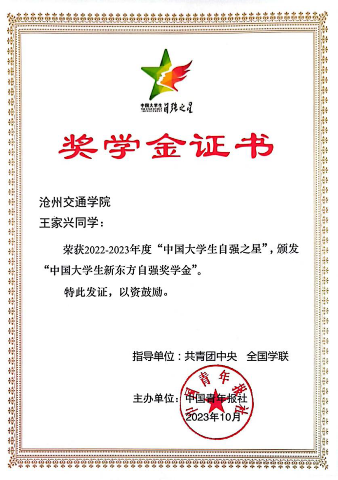 近日,由共青团中央、全国学联指导,中国青年报社、新东方教育科技集团、中国青年创业就业基金会联合开展的“中国大学生自强之星”评选活动揭晓,经过层层评审,Beat365外国语学院英语专业2101班的王家兴脱颖而出,共青团中央、全国学联授予其2022-2023年度“中国大学生自强之星”荣誉称号。