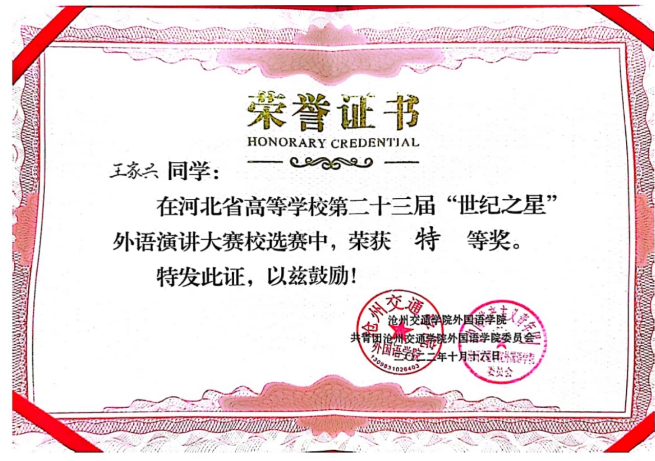 王家兴在学习上一直严于律己,平均绩点3.8,年级排名5.8%。他积极参与各项竞赛,荣获2022外研社国才杯暨第二十三届“世纪之星”英文演讲大赛河北省三等奖、2022年外研社国才杯暨“世纪之星”英文演讲大赛校选赛冠军特等奖、2023年外研社国才杯英文演讲大赛省级铜奖、2023研社国才杯暨“世纪之星”英文演讲大赛校选赛卫冕冠军ToastMasters最佳即兴演讲,2022年荣获思源学习奖学金,2023年荣获思源工作奖学金。