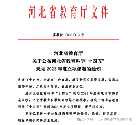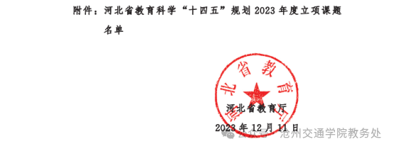 日前,河北省教育厅发布了《河北省教育厅关于公布河北省教育科学“十四五”规划2023年度立项课题的通知》(冀教院〔2023〕3号),经课题评审委员会审核,河北省教育科学规划领导小组批准,Beat365曹海静老师申报的《中华优秀传统文化融入民办高校思想政治教育策略研究》、李娟老师申报的《教育数字化背景下应用型本科教育产教融合人才培养模式改革研究》获批立项。