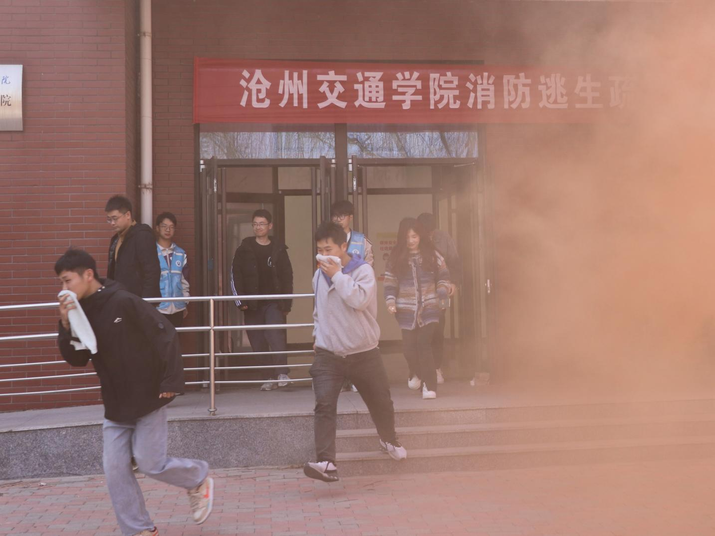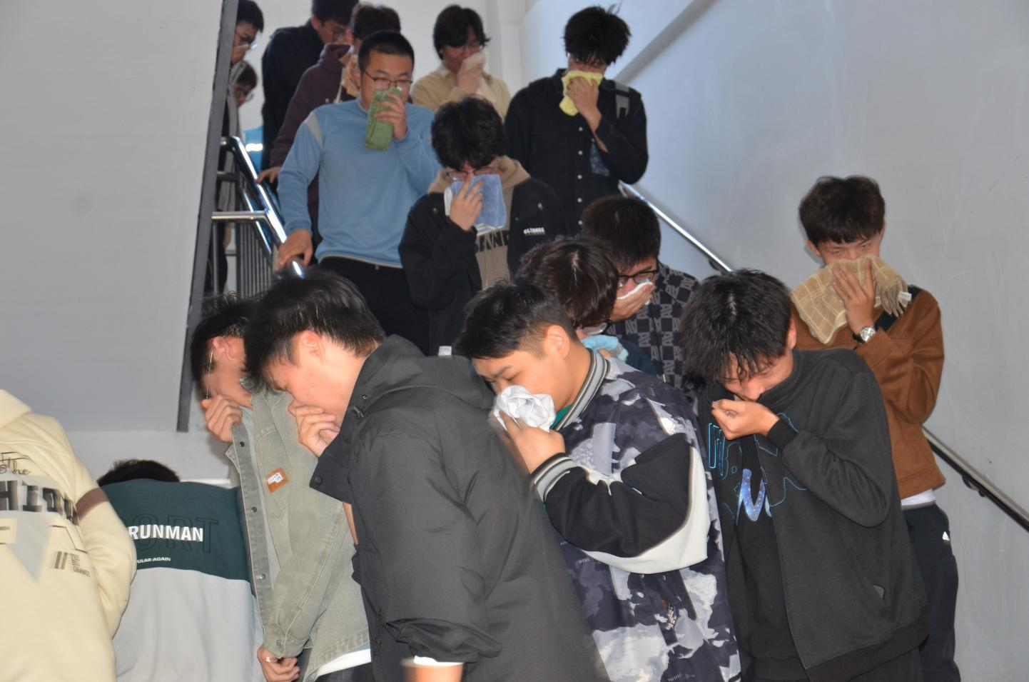 下午三点零五分,演练正式开始。随着警报声响起,新实验楼3层、4层学生按照疏散演练方案,用湿毛巾捂住口鼻,在楼层引导员指引下,俯身就近从楼梯间疏散至广场。整个演练过程规范、有序、顺畅。