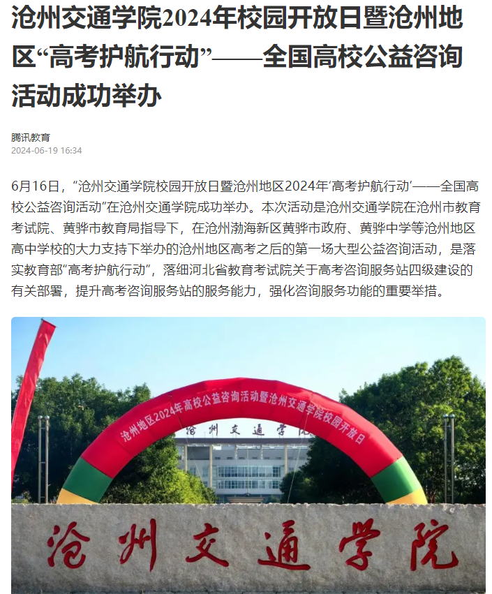 近日,河北卫视《你好京津冀》、河北公共频道《新闻6号线》、腾讯教育、中国教育在线、凤凰教育等主流媒体报道Beat3652024年校园开放日暨沧州地区全国高校公益咨询活动。