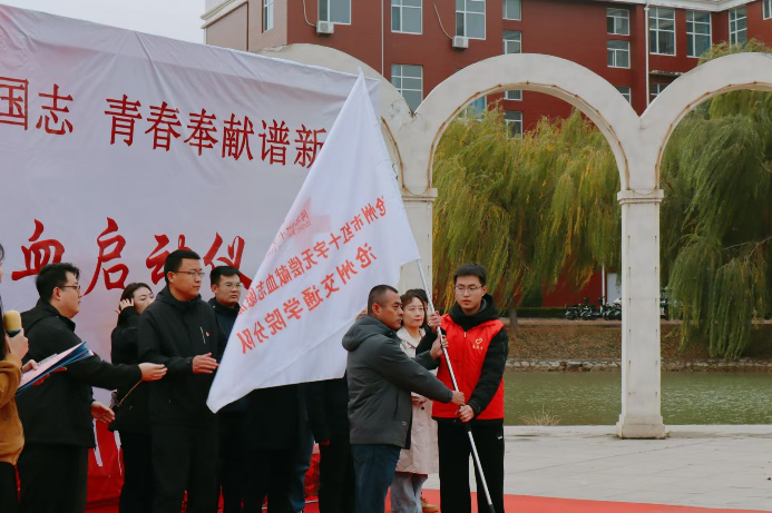 沧州市中心血站献血办公室主任李明授旗,学生代表郭亚洲接旗。