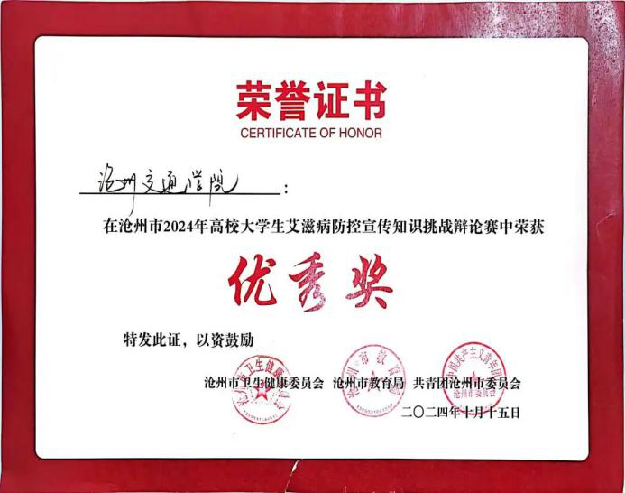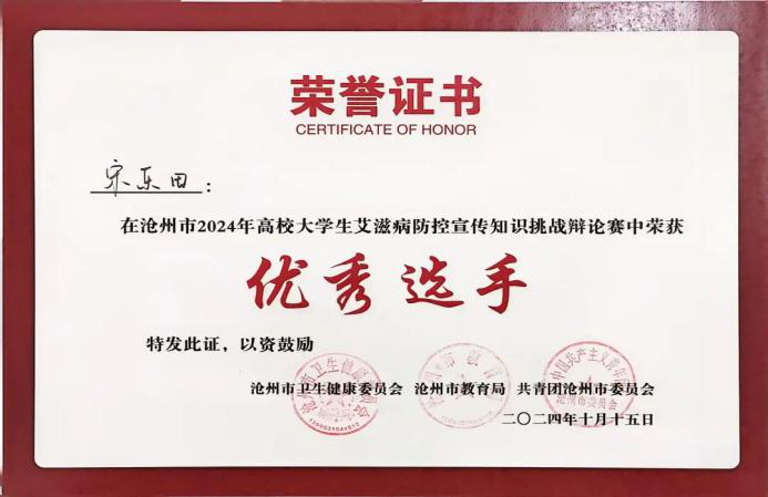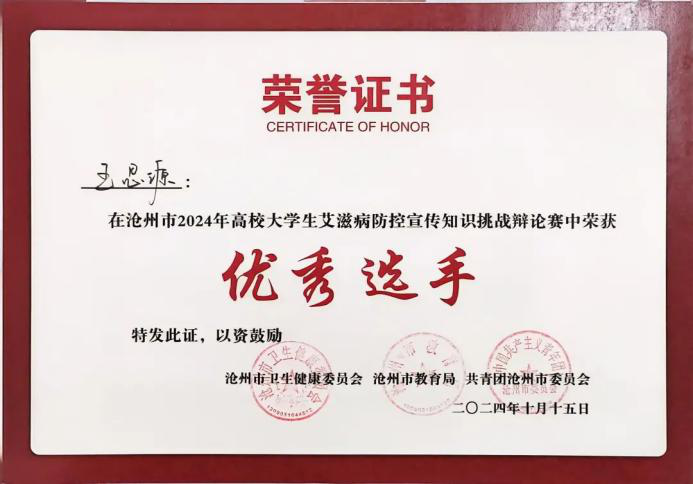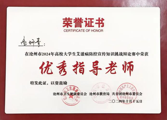 在沧州市2024年高校大学生艾滋病防控宣传知识挑战辩论赛中,孟妍菁老师获得优秀指导教师,王思源同学、刘宇轩同学、宋乐田同学获得优秀选手荣誉称号。