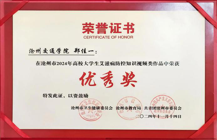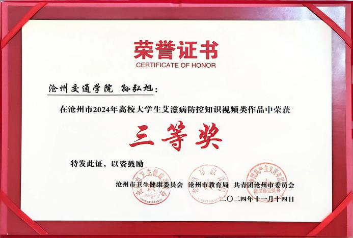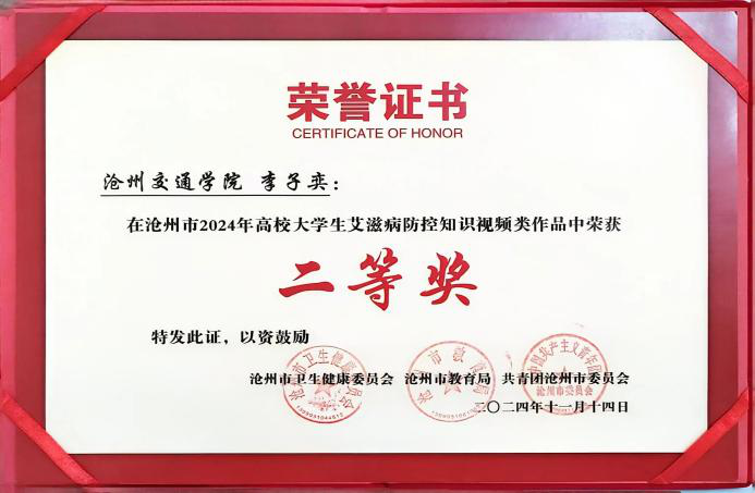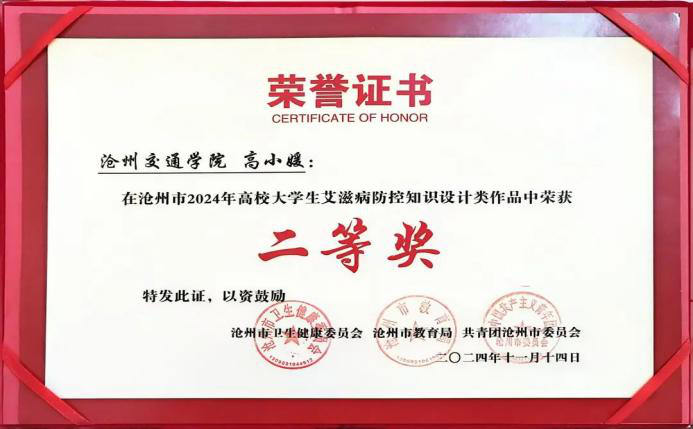 在沧州市2024年高校大学生艾滋病防控知识设计类作品中高小媛同学荣获知识设计类二等奖,江鹏北同学、孙佳惠同学荣获知识设计类优秀奖。
