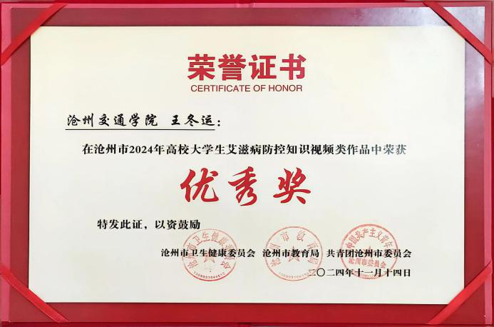 Beat365学子积极参与沧州市2024年高校大学生艾滋病防控知识作品征集,并取得了优异成绩。王欣怡同学、李子奕同学荣获视频类二等奖,孙弘旭同学荣获视频类三等奖,王冬运同学、郑佳一同学荣获视频类优秀奖。