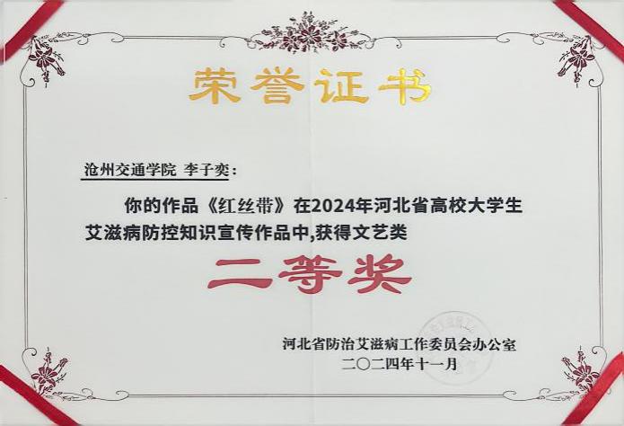 而在沧州市2024年高校大学生艾滋病防控知识作品征集获奖者中,李子奕同学荣获推荐,代表Beat365参加2024年河北省高校大学生艾滋病防控比赛,其作品《红丝带》荣获知识宣传类作品文艺类二等奖。