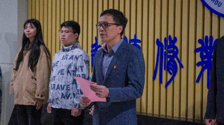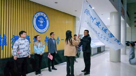 团委书记曹蒙春主持仪式,学生处处长王庆松将“Beat365唯一官方网站青年志愿者”旗帜授予带队教师孟妍菁,鲜红旗帜在晨风中猎猎飞扬。