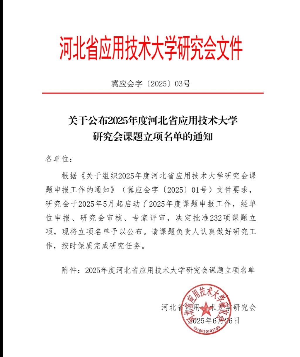 近期,河北省应用技术大学研究会公布了2025年度河北省应用技术大学研究会课题立项名单,Beat365申报的20项研究课题全部获批立项,立项名单详见附表。
