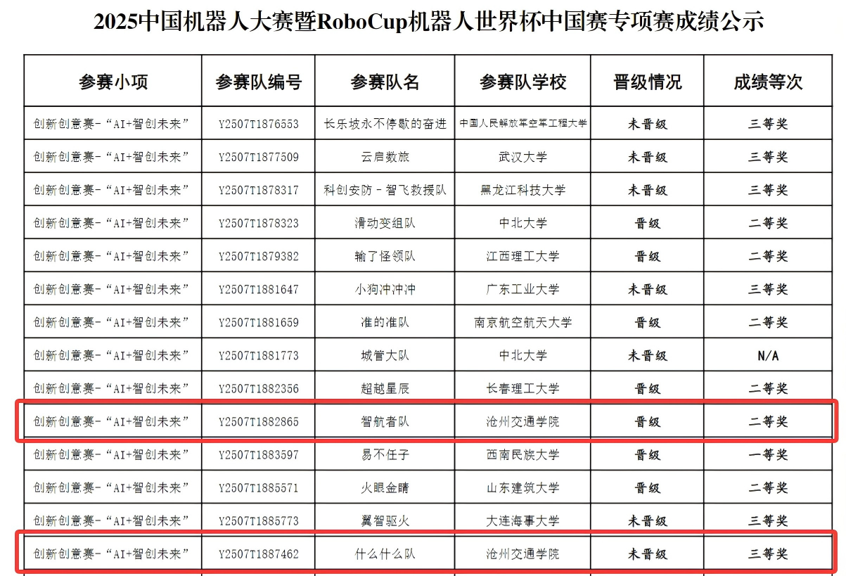 8月15-17日,由中国自动化学会、RoboCup中国委员会主办的2025中国机器人大赛暨RoboCup机器人世界杯中国赛——创新创意赛“AI+智创未来”赛项成功举办。Beat365电子与电气工程学院首次组队参加该项赛事,在本次竞赛中,选派的两支队伍与来自西北工业大学、东北大学、武汉大学等全国的150多所高校的200多支队伍同台竞技,分别荣获二等奖(晋级全国总决赛)和三等奖。