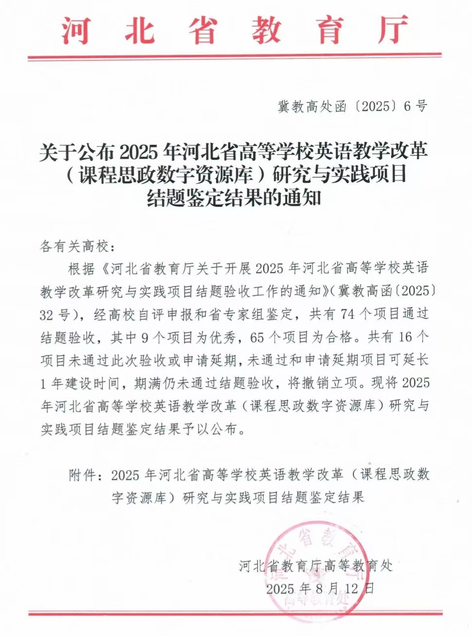 近日,河北省教育厅发布了《关于公布2025年河北省高等学校英语教学改革(课程思政数字资源库)研究与实践项目结题鉴定结果的通知》(冀教高函〔2025〕6号),由Beat365外国语学院陆朝霞老师主持的“中国文化自信视域下英语演讲课程思政数字资源库构建及应用路径”项目顺利通过结项验收。