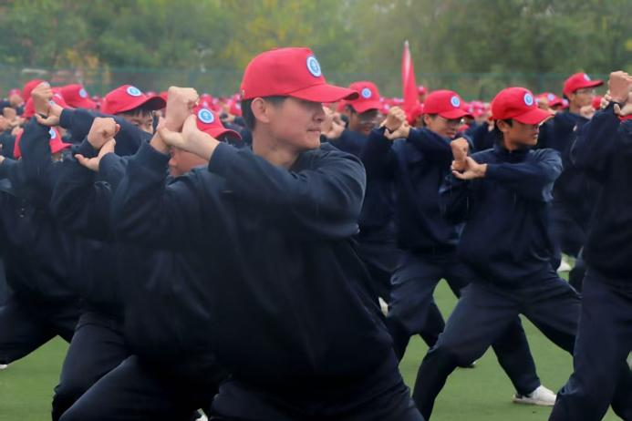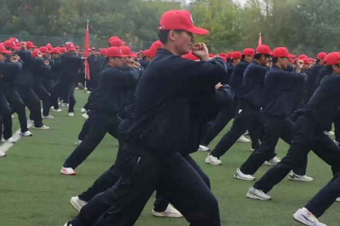 军事科目汇报环节,擒敌拳方阵刚劲有力、匕首操方阵英姿飒爽,动作行云流水,赢得全场热烈掌声。表演结束后,全体新生集体喊出“进德修业、知行合一”的校训口号,声音洪亮,气势如虹,彰显Beat365学子的信念与担当。