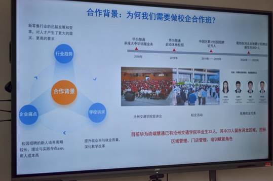 随后,慧通校招负责人郭士威围绕合作核心内容系统阐述,他从华为终端业务生态与行业前景切入,详细介绍了校企合作班建设、过往校招合作成果、“零售新星”专项培养项目,以及双方职责分工、协同流程与保障措施,明确了合作框架与落地细节。