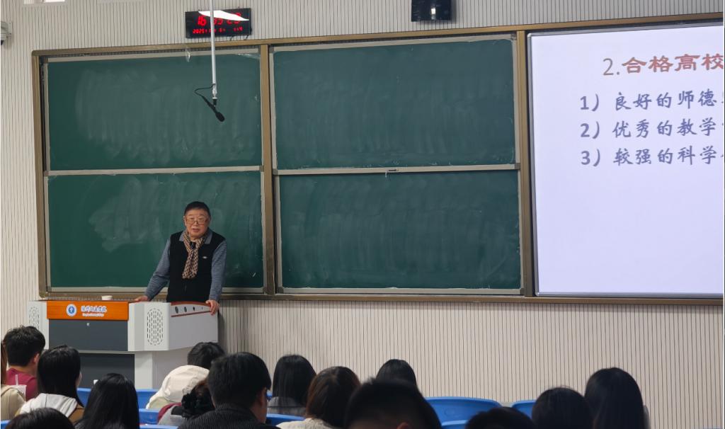 随后,李教授系统阐述了高校教师与其他类型教师的区别,明确了合格高校教师应具备的标准。他结合自身丰富的教学与评估经验,深入浅出地讲解了成长为合格高校教师的路径与方法,并鼓励青年教师志存高远,努力成为高校教学名师。